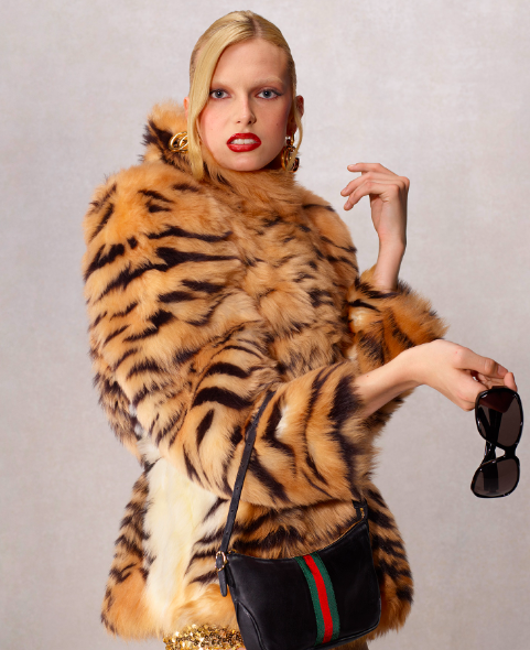House signatures (GG canvas, Dionysus hardware, tiger motifs) used with restraint not logo spam.